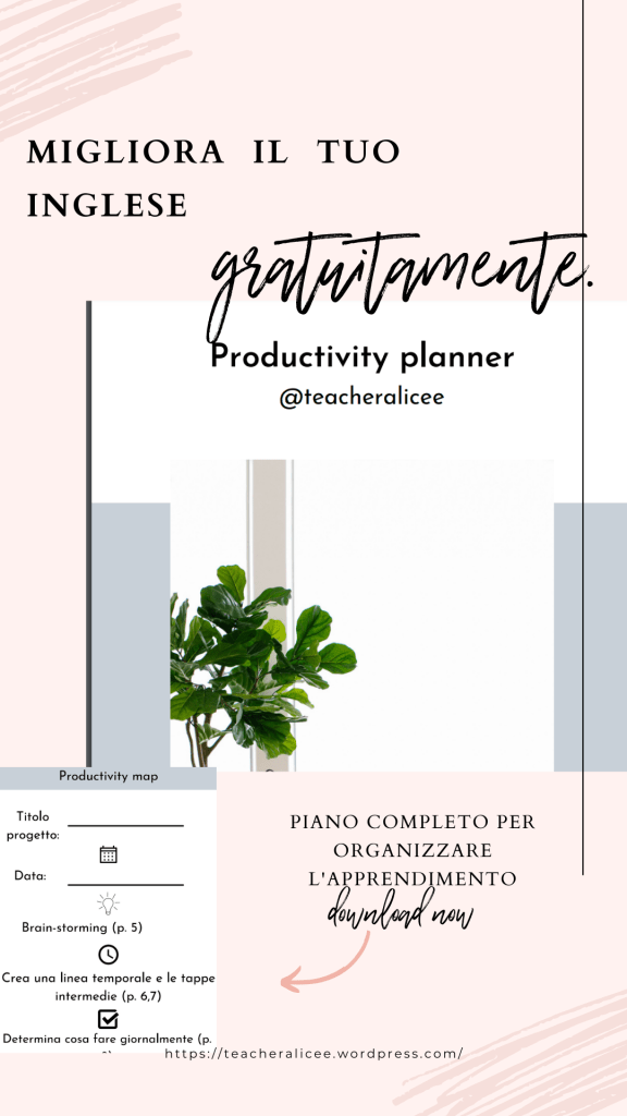 Quante volte hai pensato a come iniziare a studiare l’inglese o a riprendere l’apprendimento ma, per un motivo o per un altro, magari perché non sapevi dove o come, non l’hai fatto? A me capita spesso e quando me ne accorgo mi ripeto che è l’agire che porta chiarezza, soprattutto nei miei pensieri. Quando lavoro su grandi progetti, come la mia tesi, soprattutto quella del master, mi sento confusa da tutte le cose che devo fare. Inizio a pensare alla infinita lista di piccole cose da fare e questo mi fa venire l’ansia e così invece di agire inizio a procrastinare. Sfortunatamente però questo non mi porta da nessuna parte. Ho imparato che per sentirmi meno confusa e capire quale sia la giusta strada da prendere devo agire. Per farlo utilizzo spesso il mio planner che puoi scaricare qui (sotto la voce “Productivity planner”). Inizio scrivendo tre piccole cose da fare per iniziare, per esempio, nel caso dell’inglese, potrebbero essere “ripassare vocaboli sulle flashcards per 5 minuti”, “leggere un paragrafo di un articolo e sottolineare le parole nuove”, “inserire le parole nuove nelle flashcards”. Quando inizi, concentrati solo sulla prima azione, finché non la completi. Solo allora potrai iniziare a pensare o a preoccuparti della successiva.